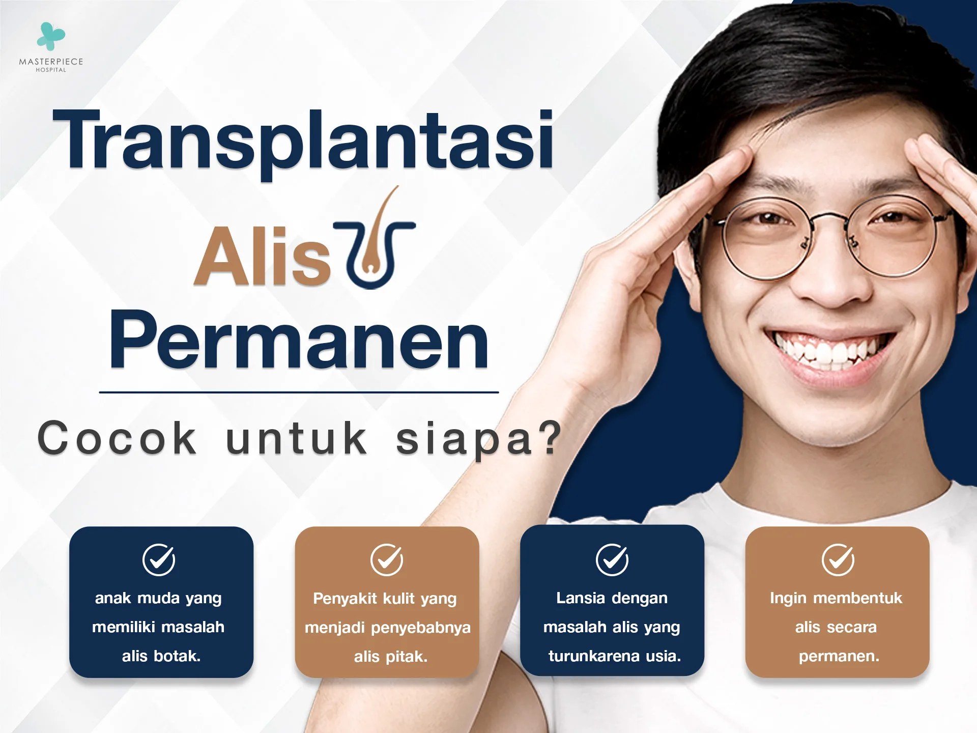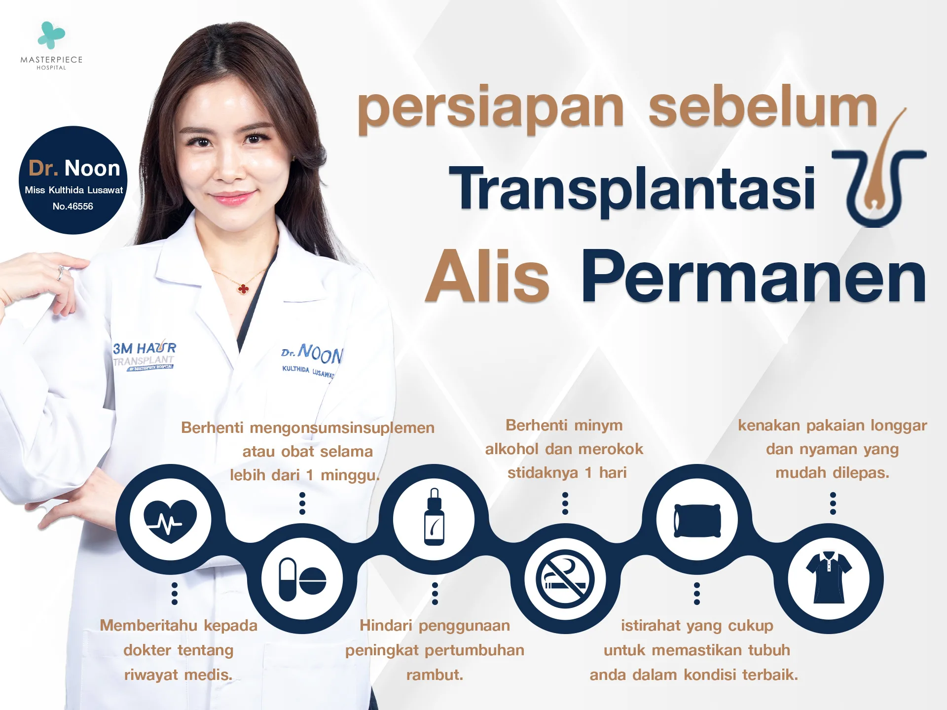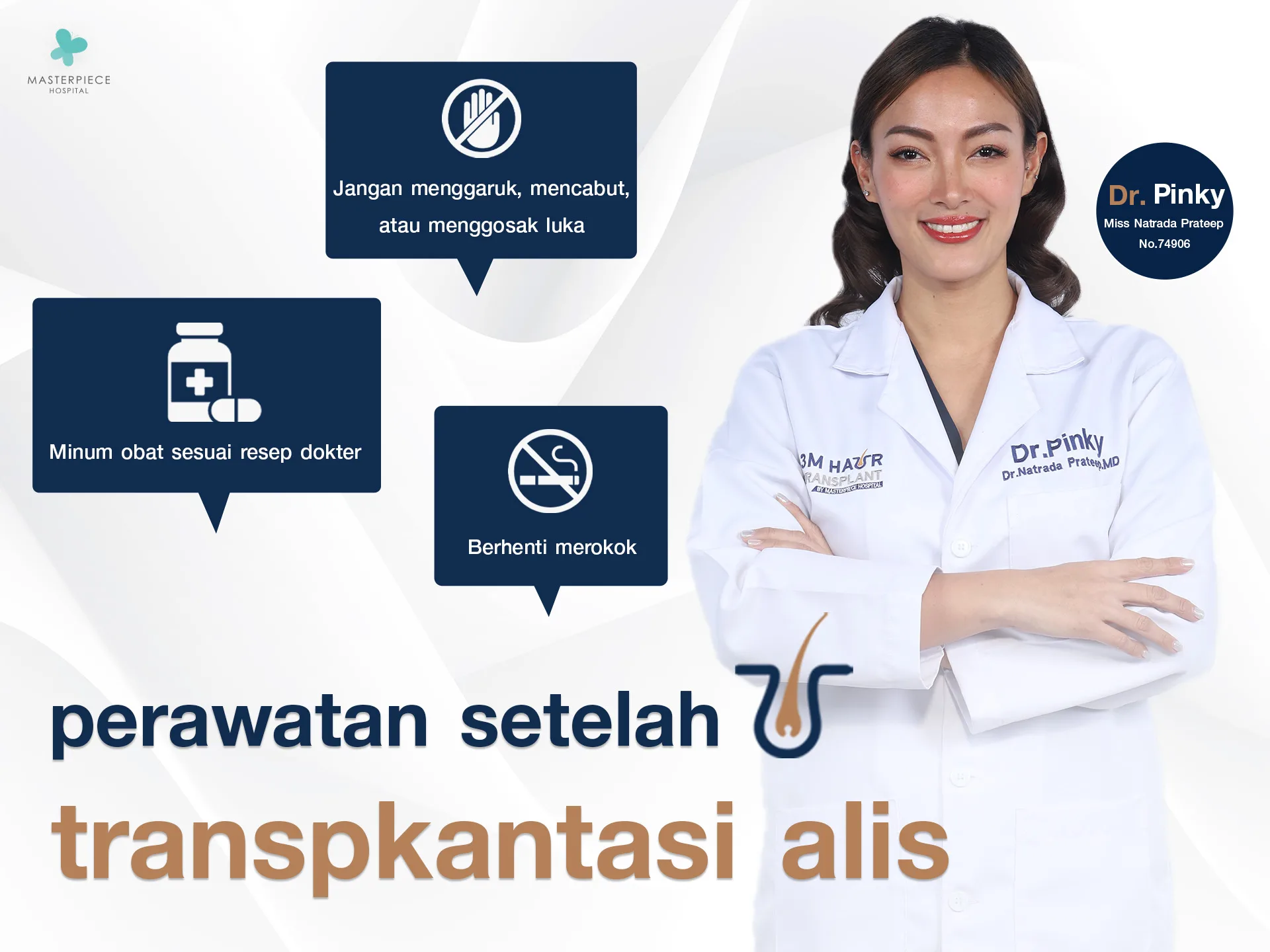 - 3M Hair Transplant by Rumah Sakit Masterpiece menyediakan layanan transplantasi rambut permanen, transplantasi alis permanen, serta transplantasi janggut dan kumis permanen dengan izin resmi dan standar medis yang sesuai hukum, serta perawatan pasien yang menyeluruh