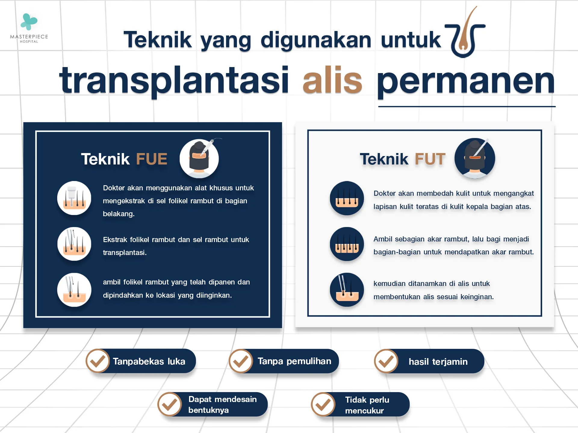 Pemilihan fasilitas medis untuk transplantasi alis permanen sangatlah penting karena hasil prosedur baru dapat terlihat jelas setelah sekitar 6 bulan. Jika hasilnya tidak sesuai harapan, tentu akan merugikan baik dari segi waktu maupun biaya. Berikut adalah alasan memilih 3M Hair Transplant by Rumah Sakit Masterpiece: