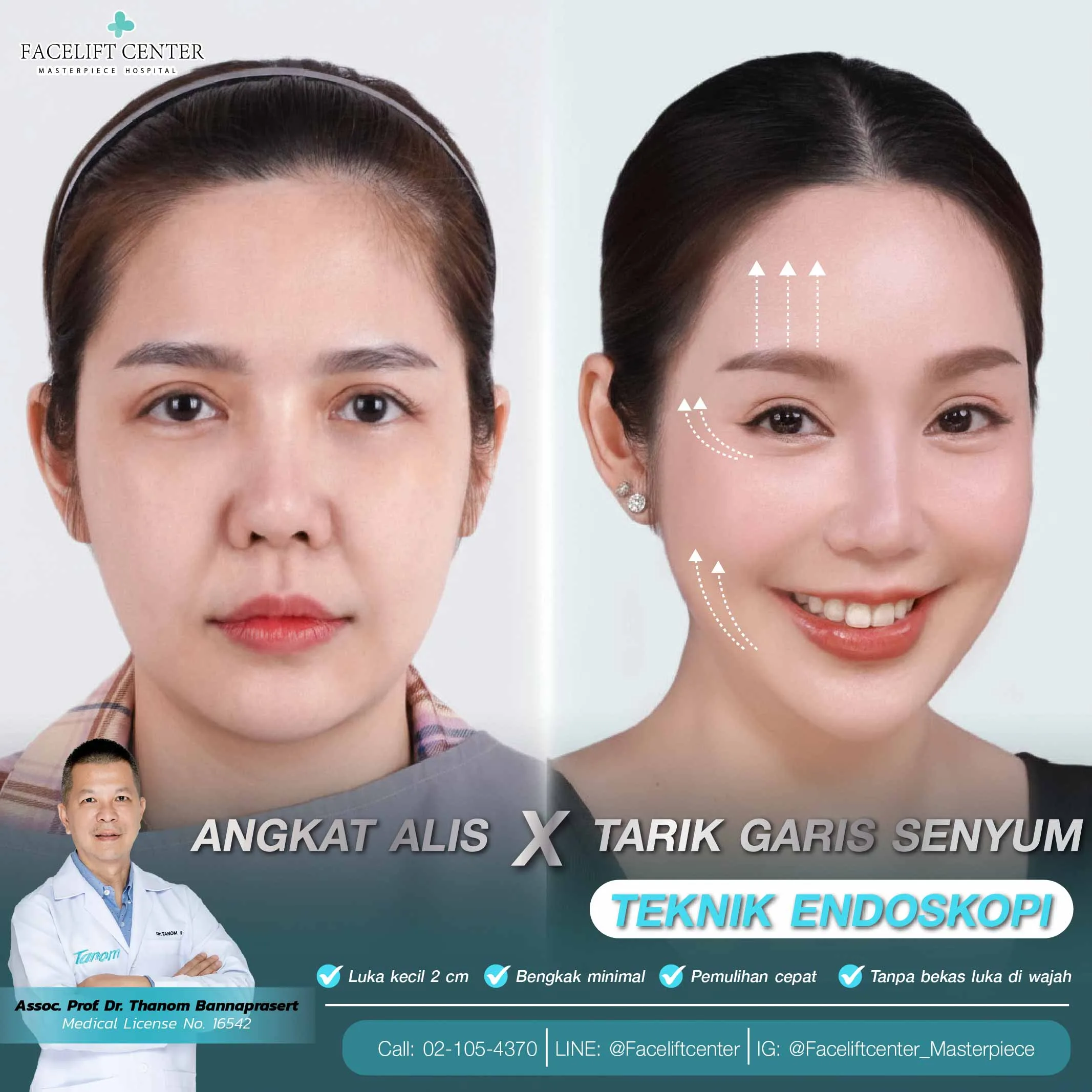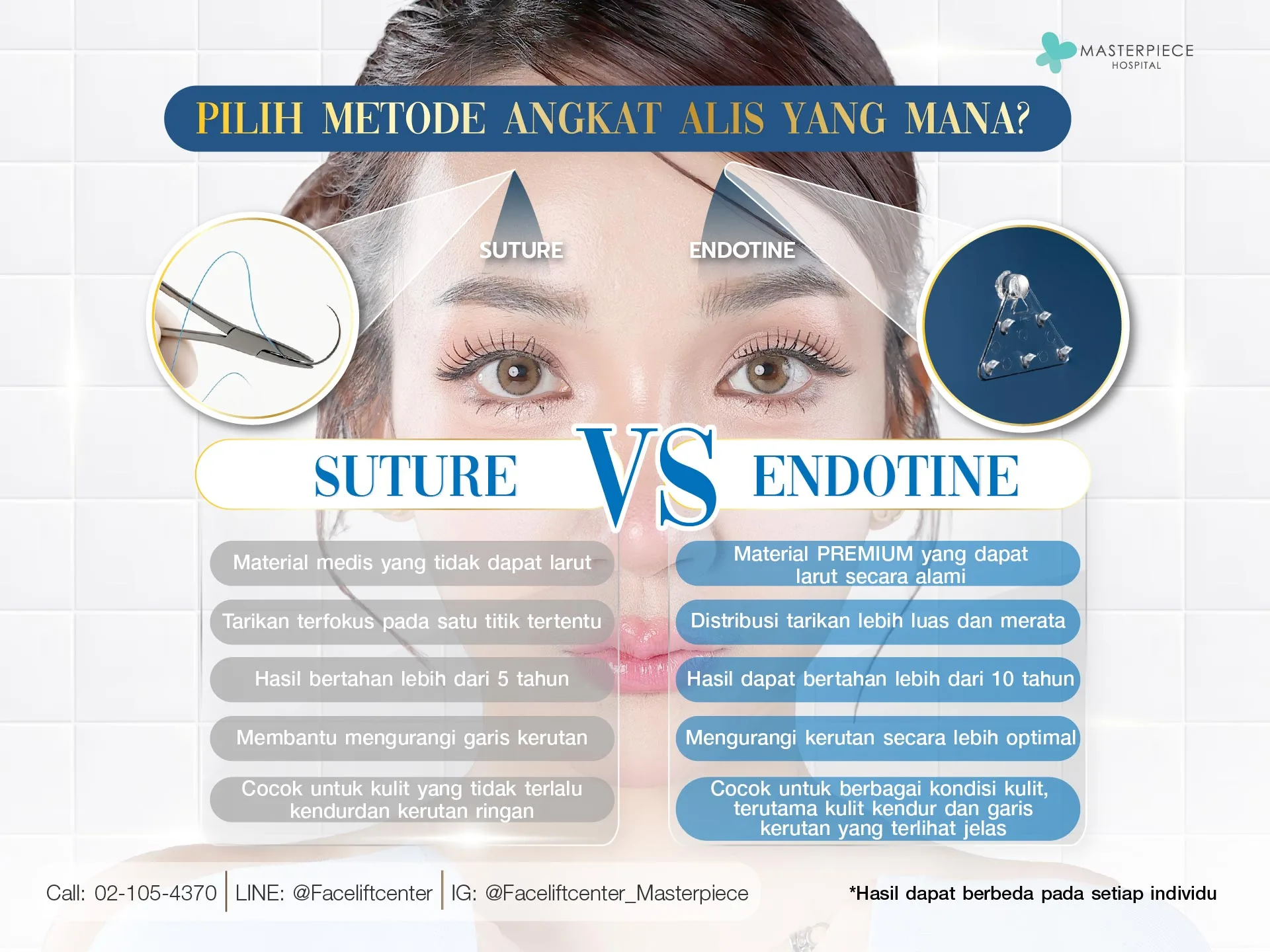 - Hasil tahan lama: Endotine aman, larut menjadi bagian tubuh dalam 1 tahun, hasil angkat alis bertahan 10–15 tahun.