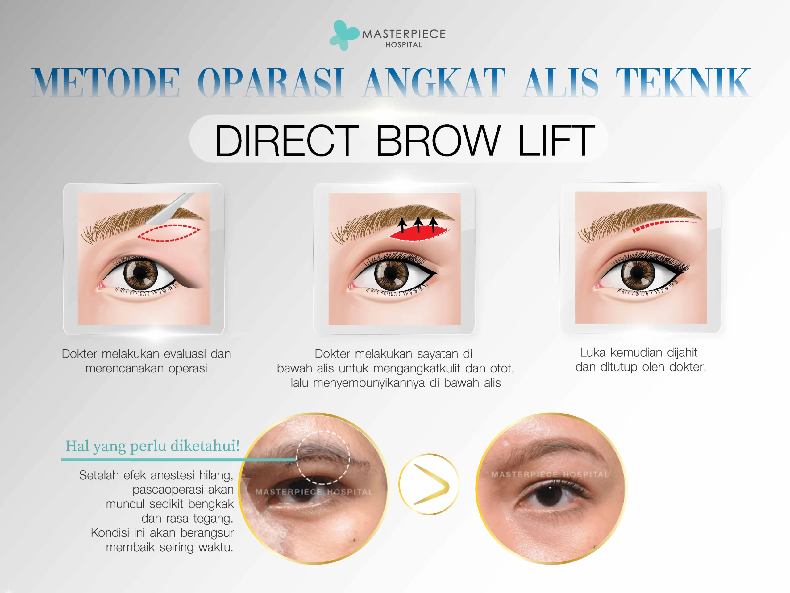 - Mengatasi alis dan kelopak mata turun: Membantu mengangkat alis, memperbaiki kelopak mata dan ujung mata yang turun.