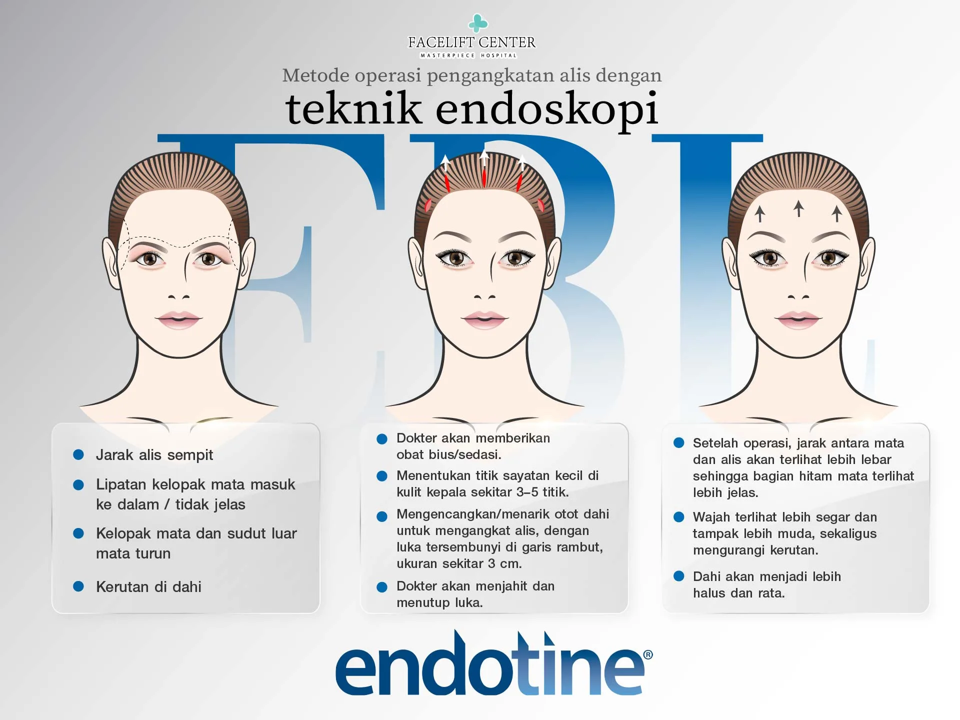Operasi pengangkatan alis atau Endotine tidak cocok untuk semua orang. Untuk hasil optimal, konsultasi dengan dokter berpengalaman sangat penting agar dokter dapat menilai kesesuaian prosedur dengan masalah pasien. Jika dilakukan oleh dokter yang kurang berpengalaman, ujung alis dan sudut mata bisa turun kembali dalam waktu singkat. Pilih juga fasilitas medis bersertifikat agar hasil aman, alami, dan estetik.