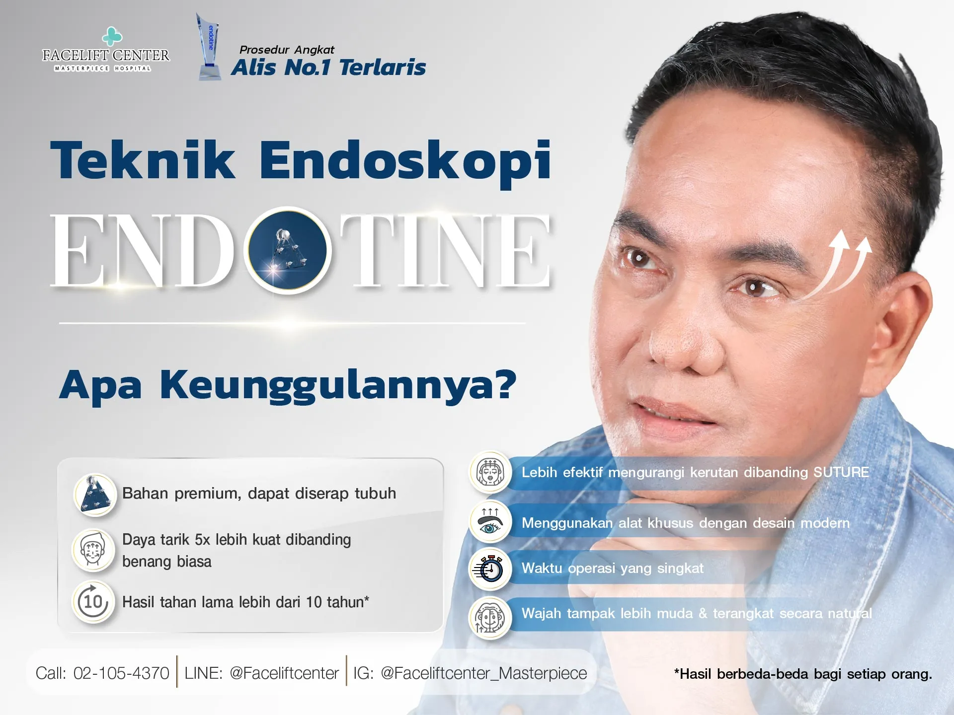 - Hasil tidak permanen: Teknik Endotine dapat memberikan hasil hingga 5–10 tahun, tergantung beberapa faktor.