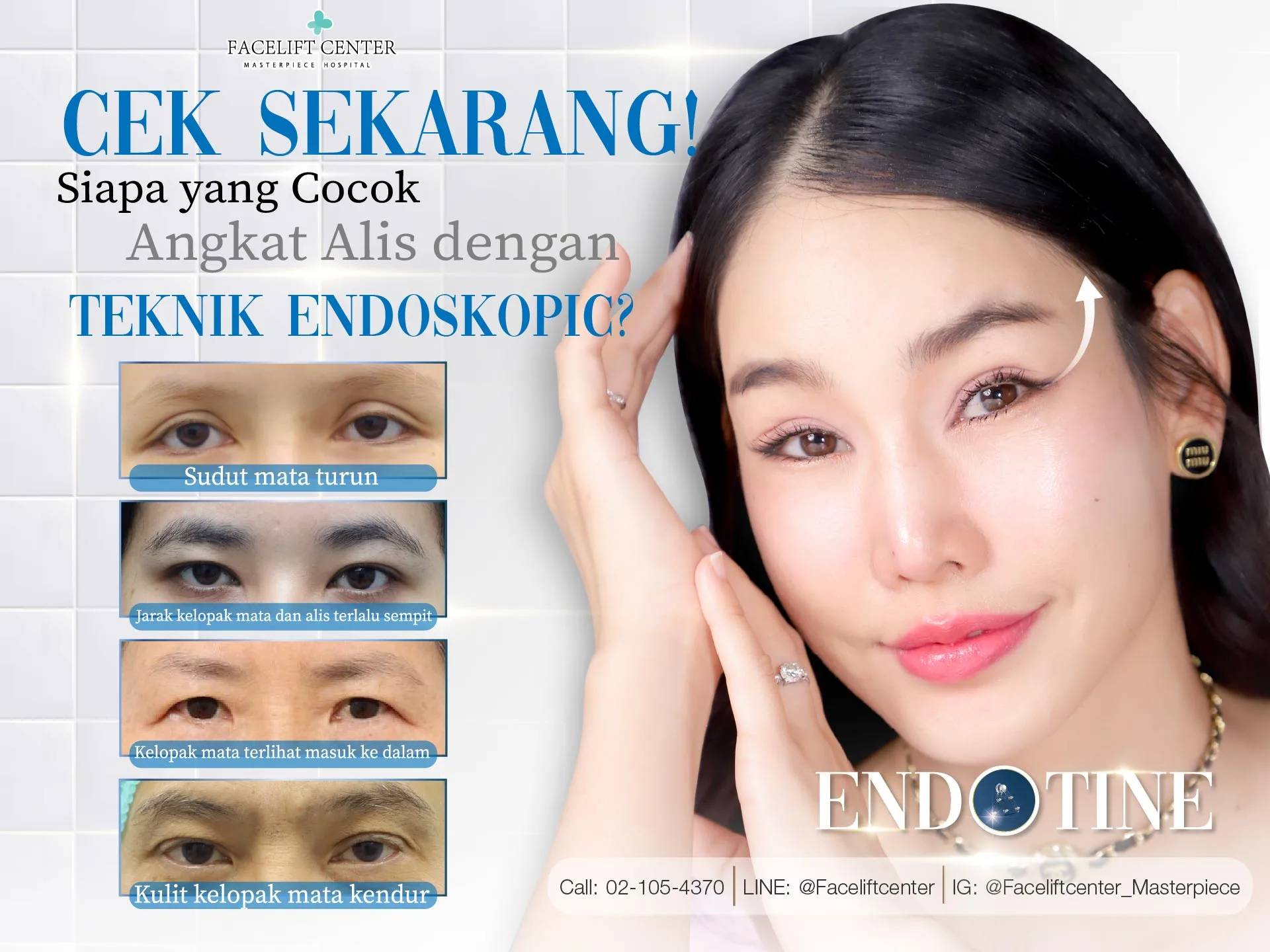 Pengangkatan alis (Endoscopic Brow Lift) dapat dianggap sebagai salah satu jenis operasi bedah kosmetik untuk perbaikan area mata. Masalah kerutan dan penuaan kulit akibat bertambahnya usia dapat diatasi dengan prosedur ini, termasuk mengangkat ujung alis yang turun. Namun, untuk melakukan operasi angkat alis dengan teknik Endotine agar terlihat indah dan alami, dibutuhkan keterampilan dan keahlian dari dokter bedah spesialis. Jika operasi dilakukan dengan metode yang salah atau oleh dokter yang kurang berpengalaman, mata bisa kembali turun dalam jangka waktu tertentu dan hasilnya mungkin hanya bersifat sementara, sehingga pasien harus mengeluarkan biaya tambahan dan mengalami rasa sakit tanpa manfaat.