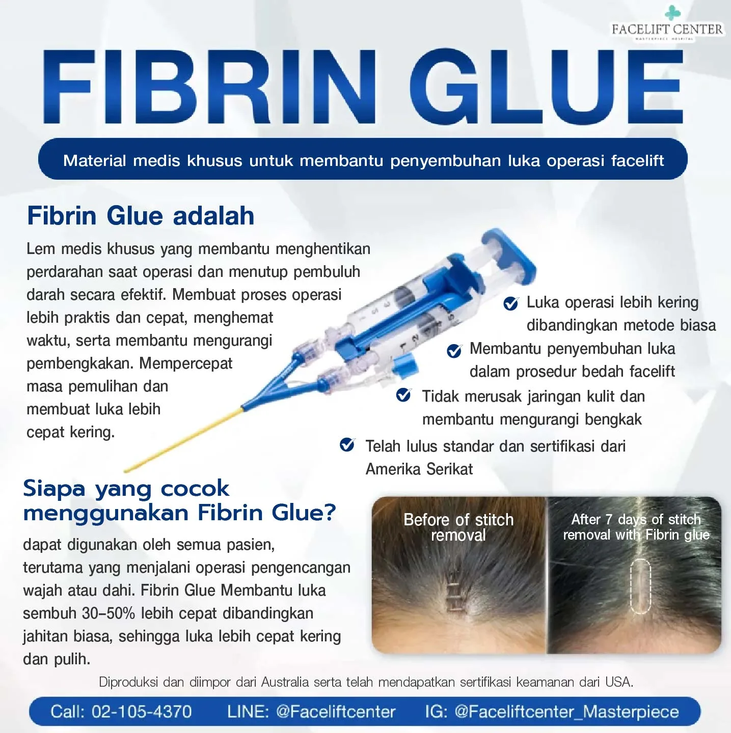 Fibrin Glue adalah campuran dua bahan, fibrinogen dan thrombin, yang diekstrak dari darah. Campuran ini mengeras menjadi gel untuk menghentikan perdarahan dengan efektif. Dimasukkan dari Austria dan disetujui aman oleh USA. Berfungsi sebagai lem alami untuk menutup luka operasi dan mempercepat penyembuhan.