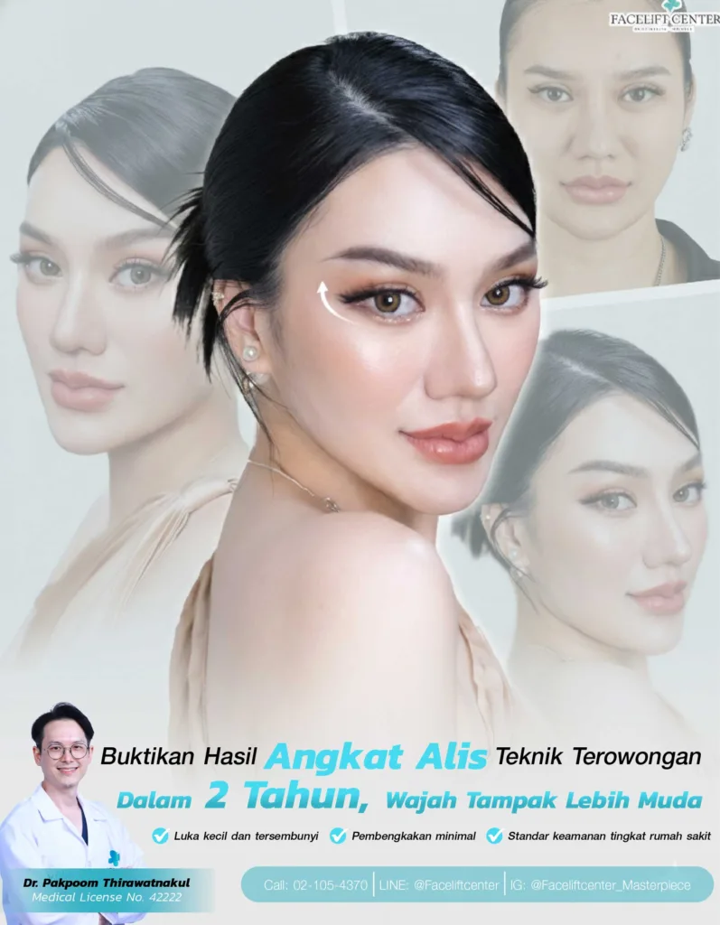 - Suntik Botox: Menggunakan toksin botulinum di bawah alis untuk menghambat otot, sehingga alis terangkat sedikit. Hasil bertahan sekitar 3–4 bulan, perlu pengulangan.