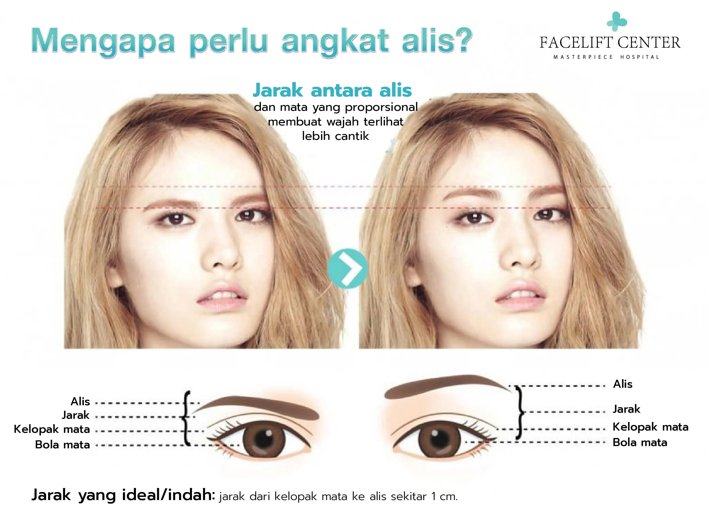 Semua orang tentu ingin memiliki mata indah, sehingga ingin melakukan operasi lipatan kelopak mata ganda. Namun, mengapa harus melakukan angkat alis juga? Setiap orang memiliki anatomi wajah berbeda. Beberapa orang cukup melakukan lipatan kelopak mata ganda untuk terlihat lebih indah, tetapi bagi mereka yang memiliki jarak antara mata dan alis sempit, lipatan kelopak mata ganda justru membuat jarak antara mata dan alis semakin sempit, sehingga wajah terlihat tegas dan lebih tua.